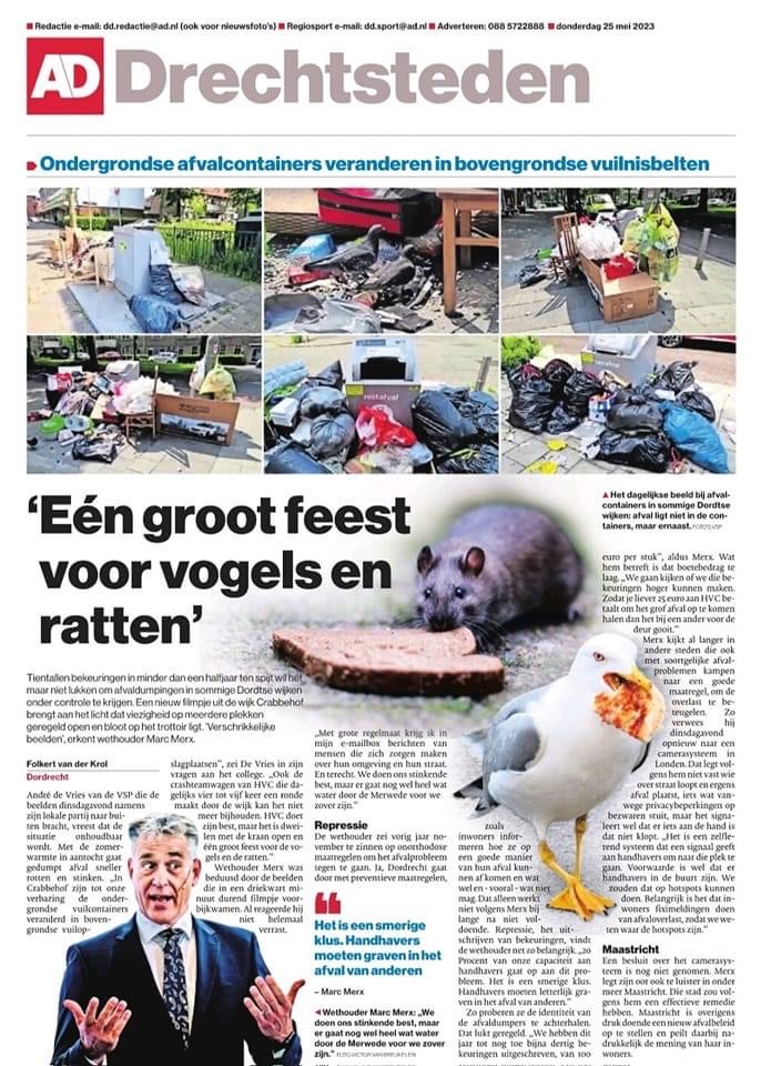 Wat gaan we hier nu aan doen, deze dagelijkse situatie is zeker nu de zomer er aan komt niet houdbaar meer, ook de crashteam wagen van HVC die dagelijks 4 tot 5 keer een ronde maakt door de wijk kan het niet meer bijhouden. HVC doet zijn best maar het is dweilen met de kraan open en één groot feest voor de vogels en de ratten.