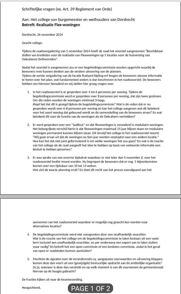 🇦🇹Onlangs is een eerste bijeenkomst geweest met bewoners en de begeleidingscommissie. Tot verbazing van de bewoners lijkt het er op dat er in de uitvoering een andere insteek wordt gekozen dan zoals op 5 november besloten. Om hierover duidelijkheid te krijgen hebben een aantal oppositie partijen, De VSP , Forum voor Democratie -FVD , Beter Voor Dordt en Fractie Van Waardhuizen , vragen gesteld aan het college om duidelijk te krijgen wat hier nu precies gebeurt.
