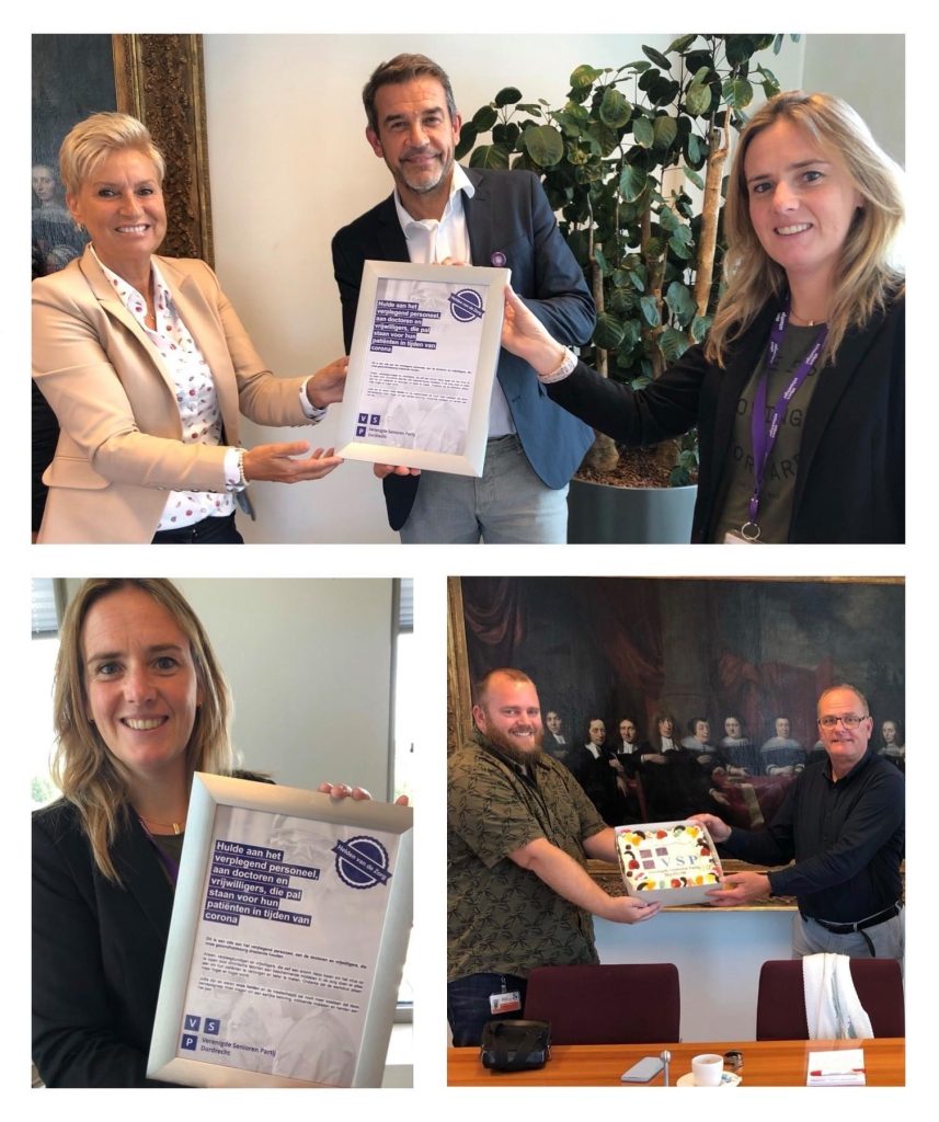 Diezelfde dag hebben wij een oorkonde en een taart overhandigd aan de voorzitters van de Ondernemingsraad en Verpleegkundige Adviesraad van het Albert Schweitzer Ziekenhuis. Het is een hulde aan alle zorgverleners die pal stonden voor patiënten in tijden van corona. “Voor alles wat zij hebben doorstaan de afgelopen maanden in tijden van corona".