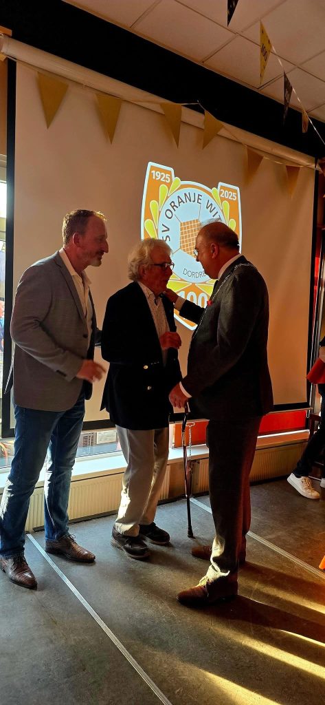 Sv Oranje Wit Dordrecht heeft donderdagavond de Koninklijke Erepenning ontvangen ter gelegenheid van haar 100-jarig jubileum. Waarnemend burgemeester Van der Velden reikte de onderscheiding uit aan voorzitter Martijn de Haas en oud voorzitters Leen Bozuwa, Jan-Willem Bozuwa en Leen van Driel. Met meer dan 1900 leden en een breed aanbod aan sportactiviteiten, waaronder een G-team, speelt Oranje Wit een cruciale rol in de Dordtse gemeenschap. Deze erkenning is een prachtige bekroning voor hun inzet en betrokkenheid. 🏅
