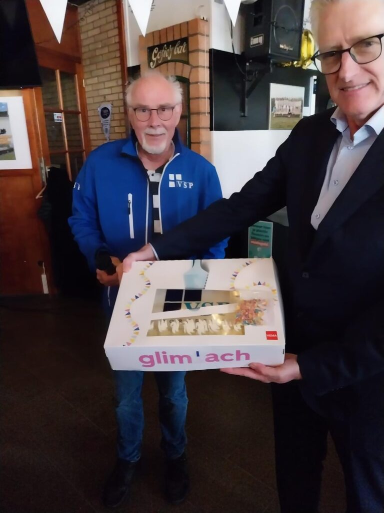 Het lange wachten is nu eindelijk beloond voor de Dubbeldammers. De VSP heeft traditioneel een taart aangeboden aan voorzitter Arie in ‘t Veld.
